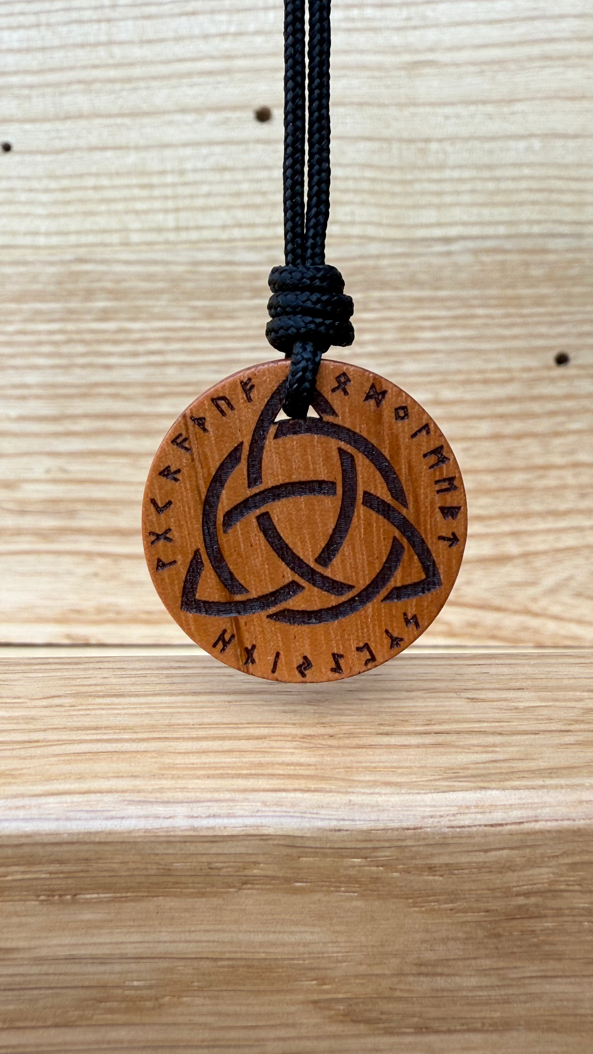 Antico simbolo utilizzato in molte culture, rappresenta concetti di trinità, triplicità e ciclicità. Questo ciondolo è realizzato in legno di okoumè ed è decorato con rune celtiche