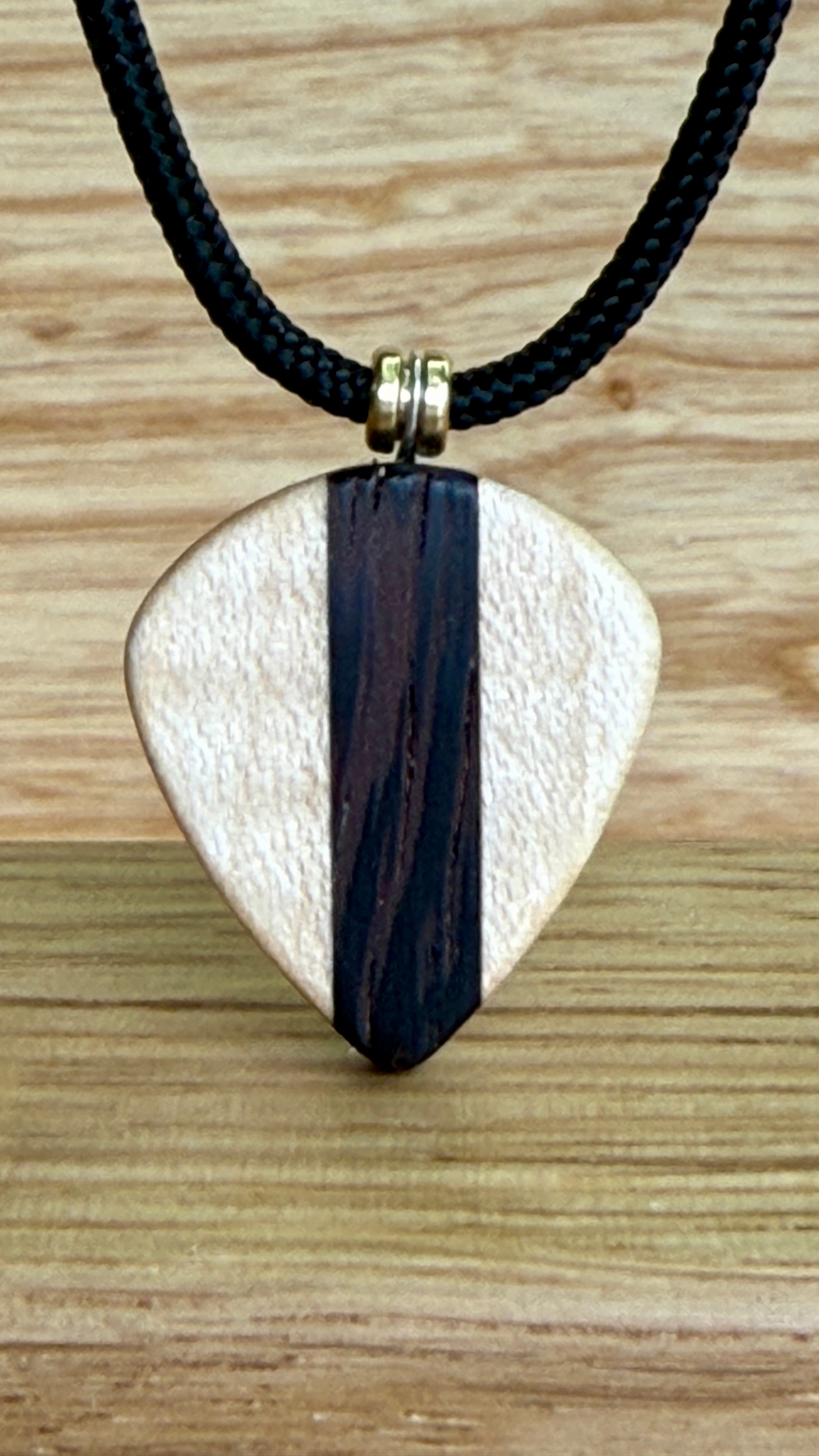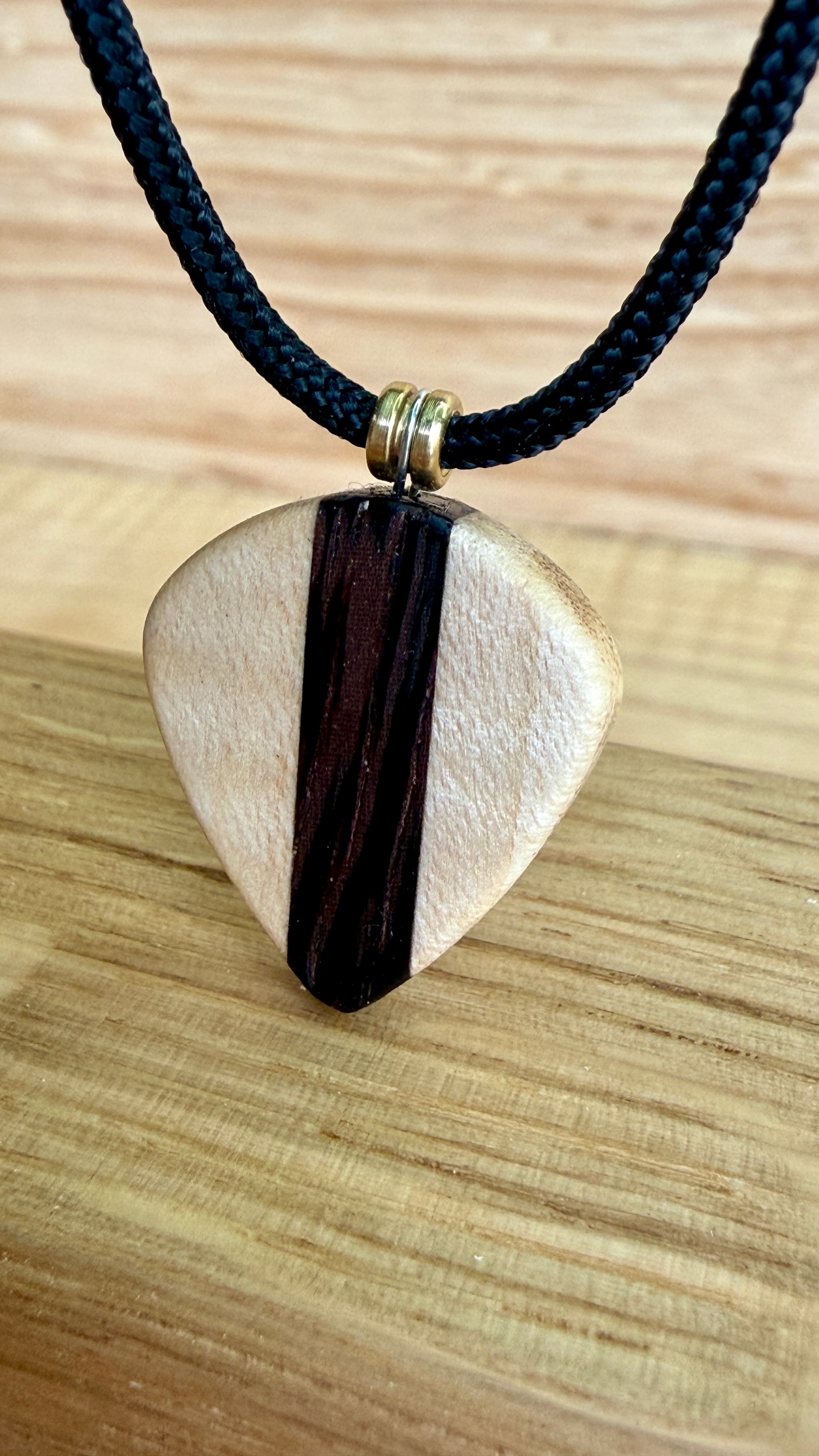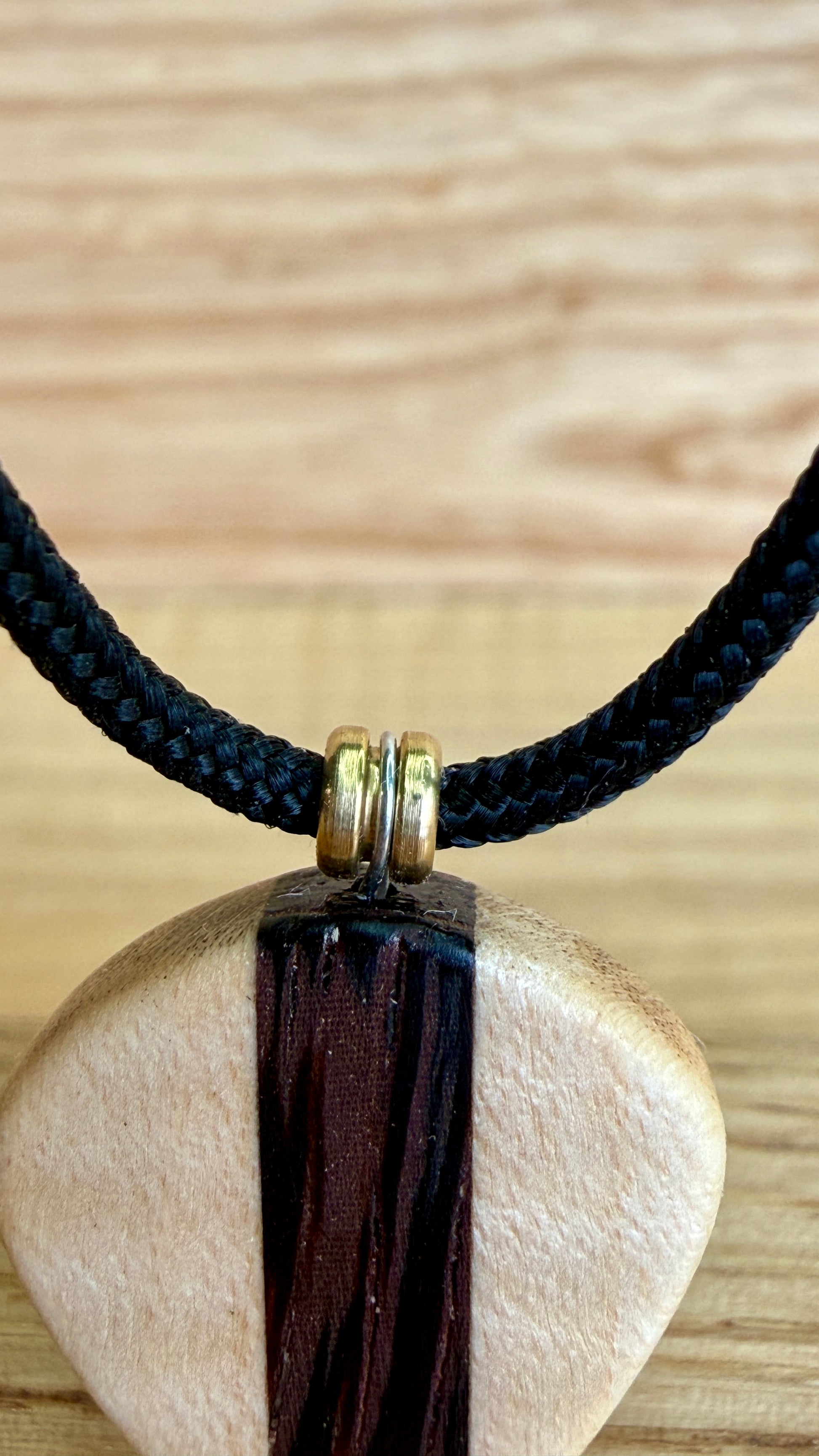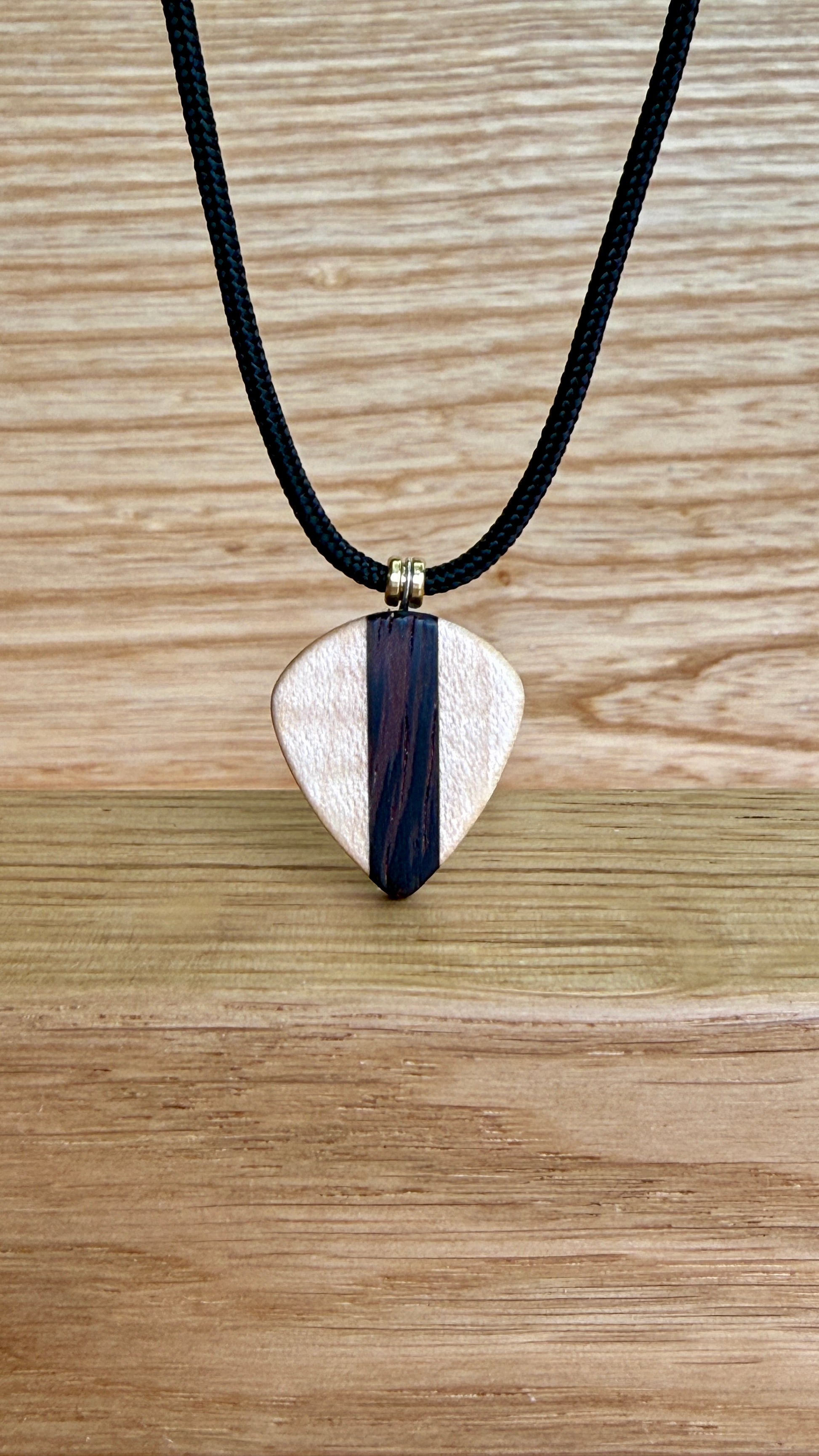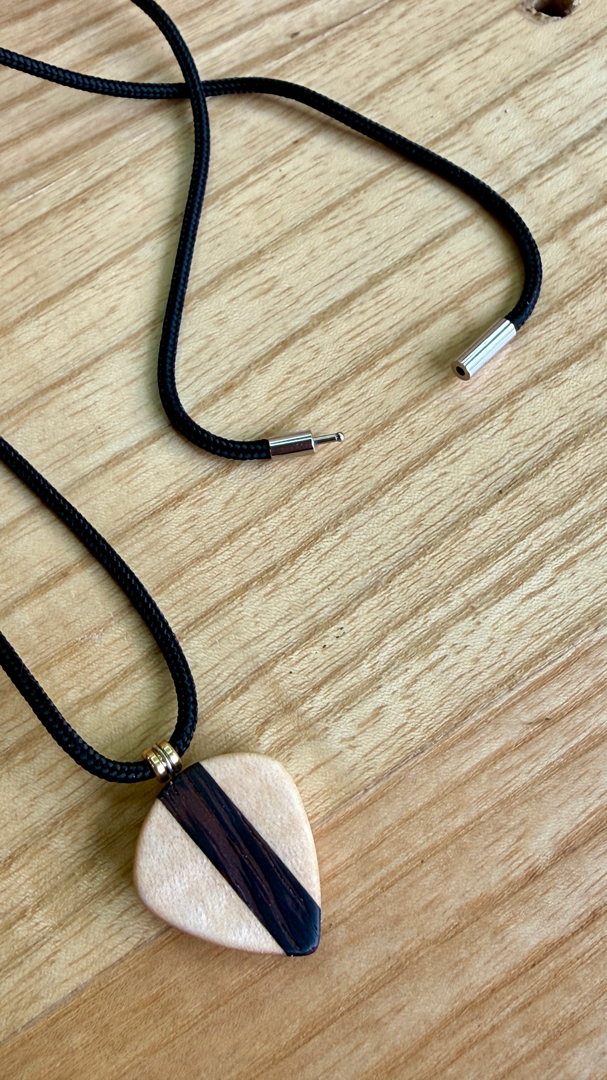 Realizzato a mano in Italia, questo ciondolo riprende la forma compatta dei plettri Petrucci, con una lavorazione accurata che esalta il contrasto naturale tra i due legni.