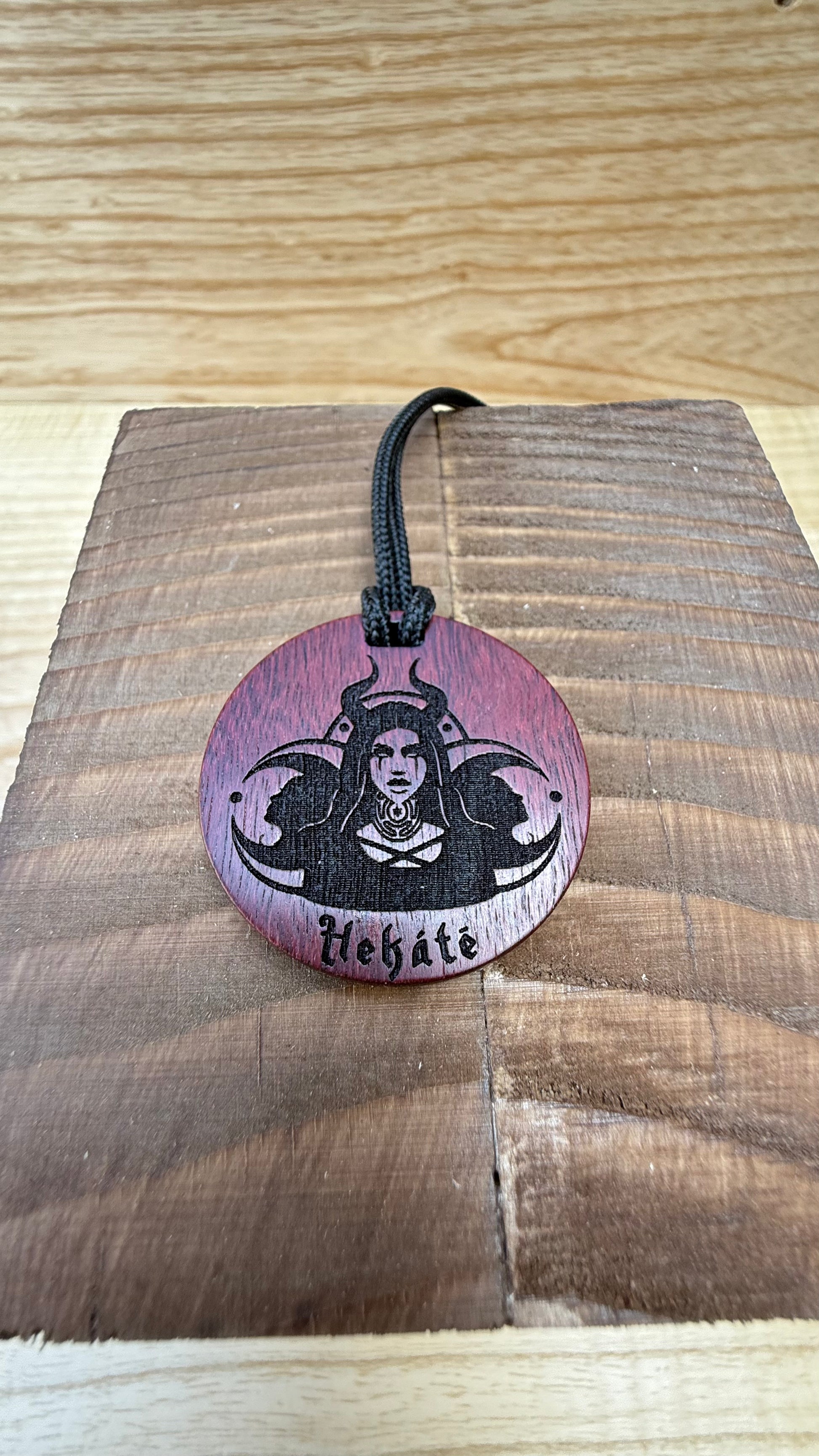 Questo pendente realizzato in mellissimo legno amaranto, Rappresenta Hekate, Dea della magia, stregoneria, oscorità, notte, luna, fantasmi e necromanzia