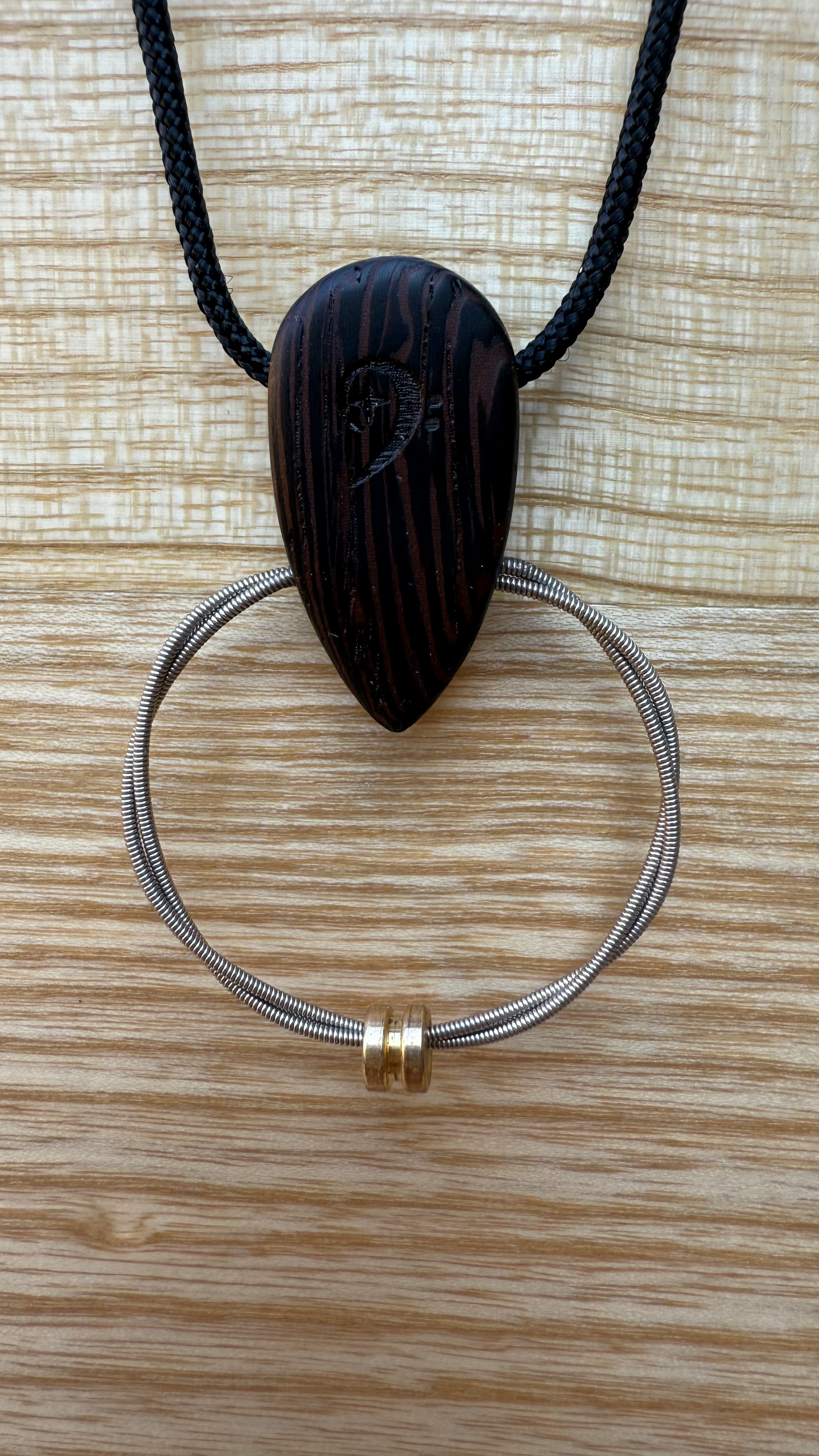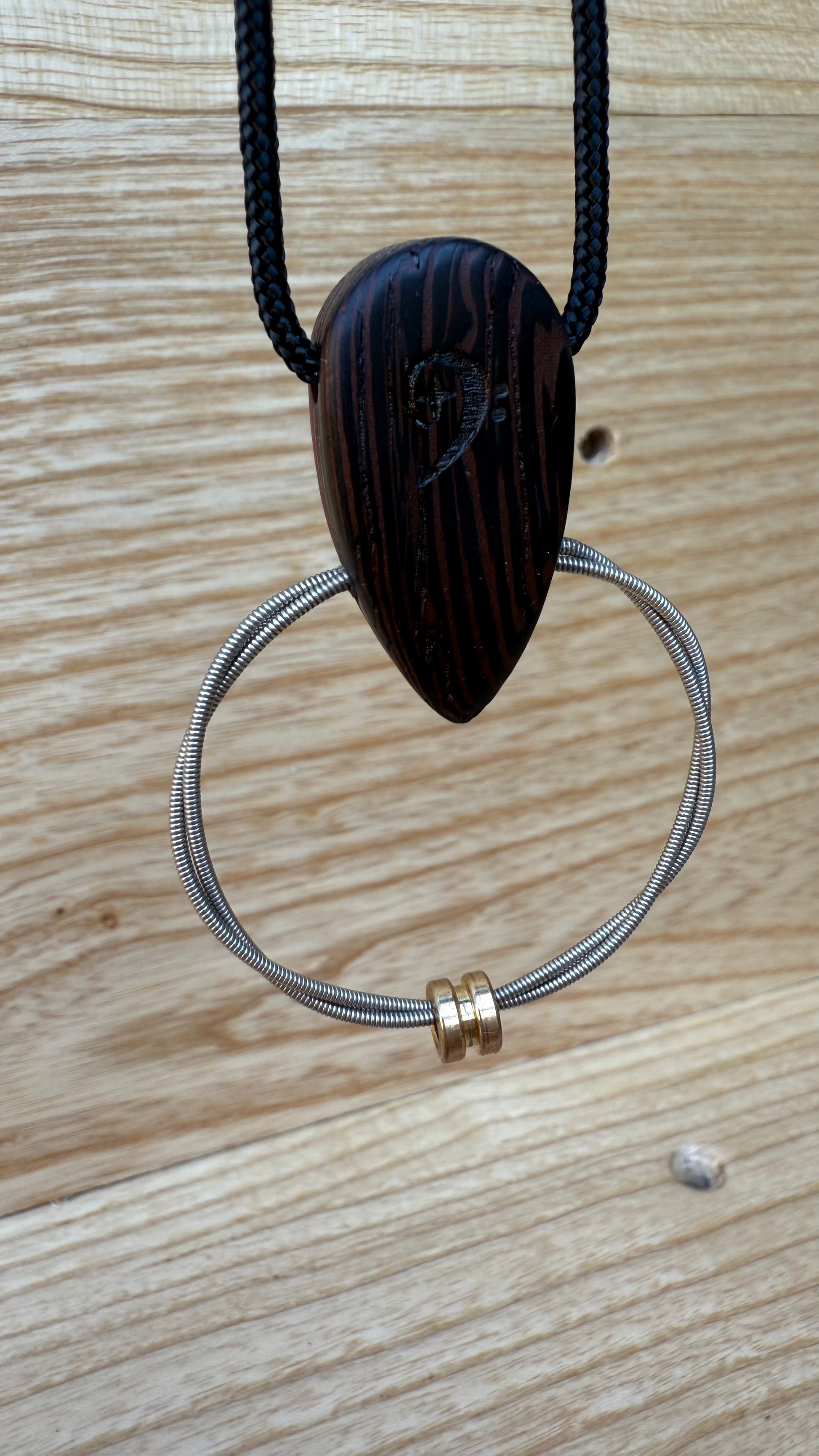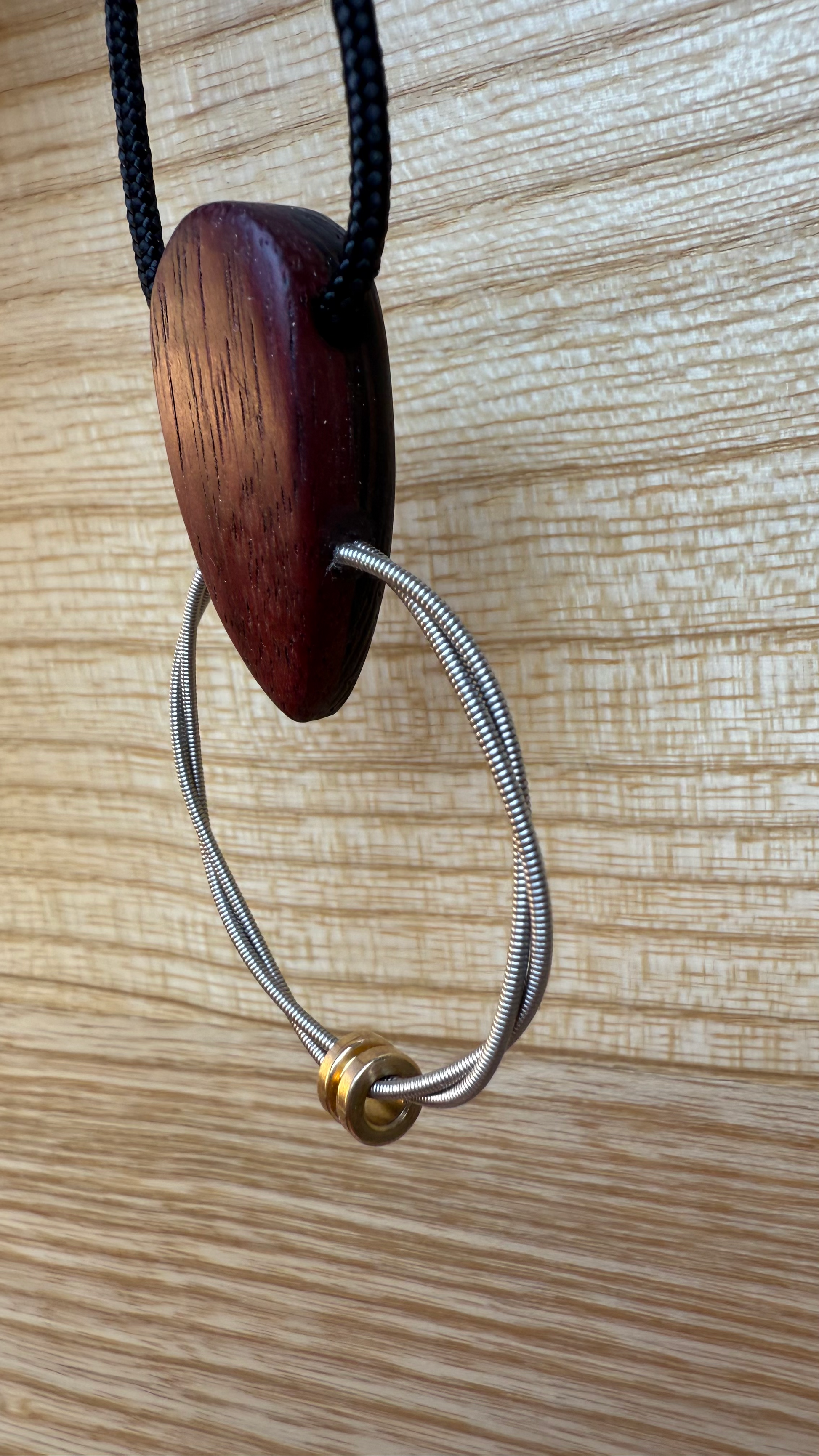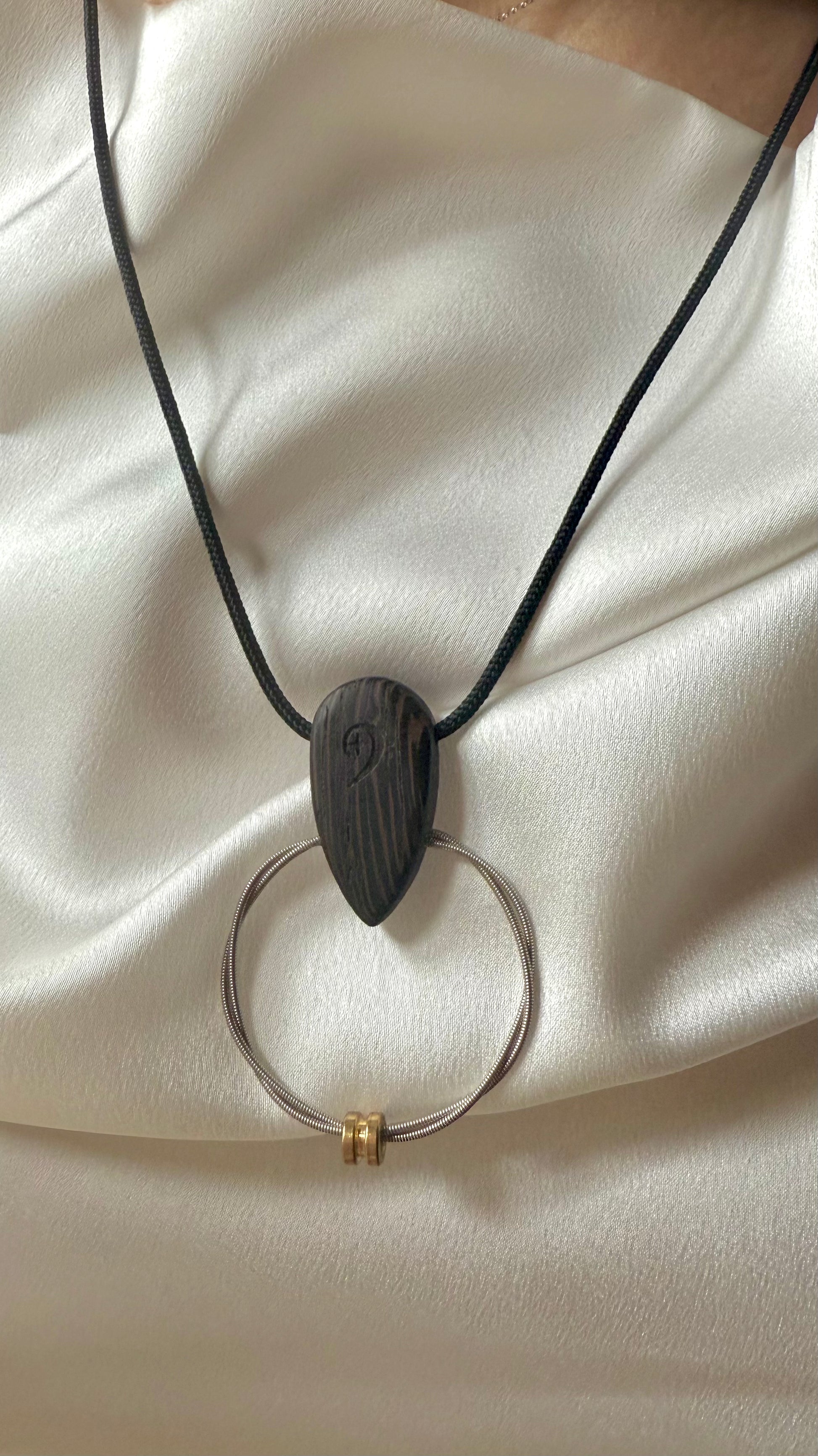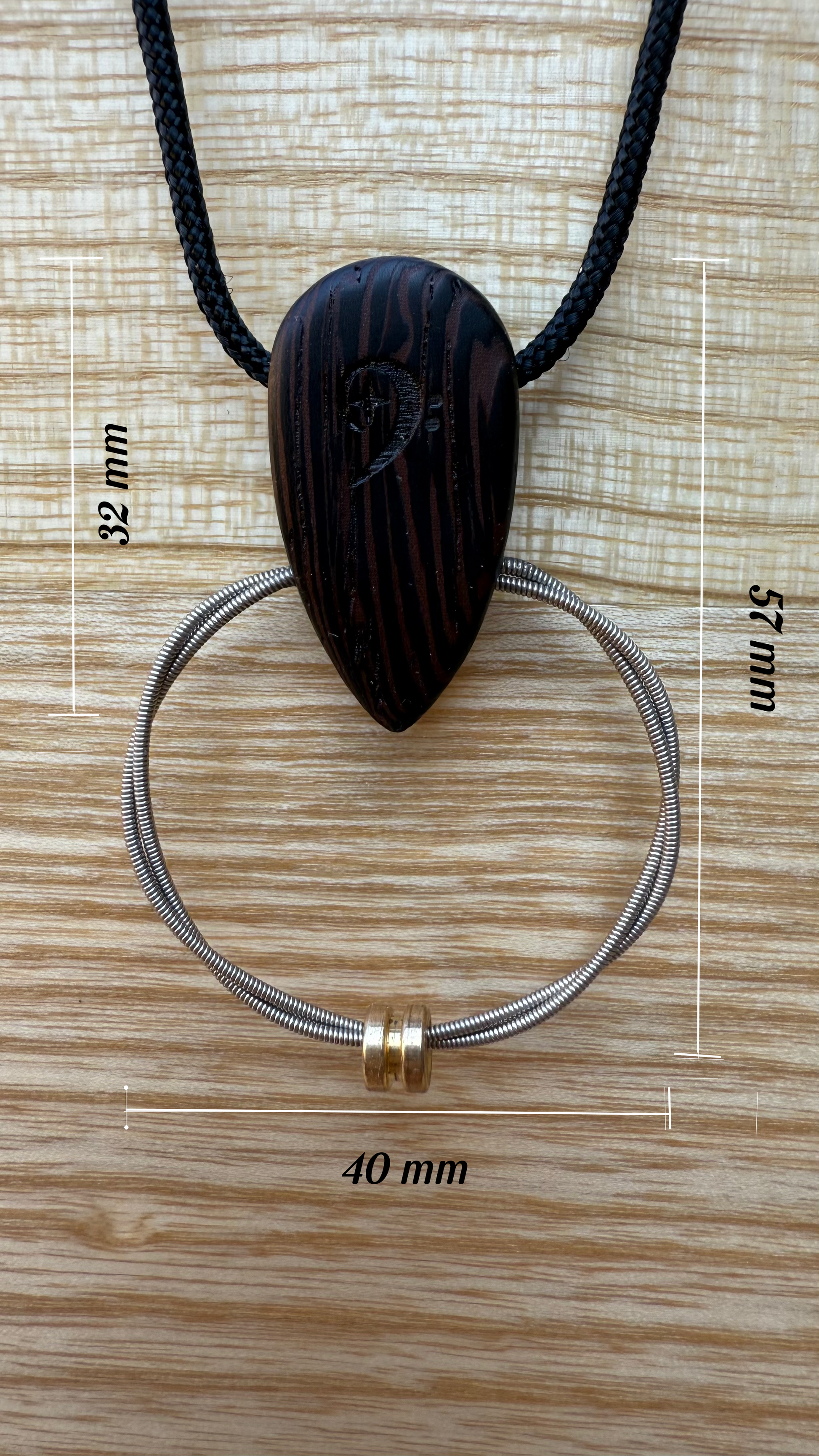 La corda, completa del blocco dorato per ponte, forma un cerchio da 40 mm di diametro, mentre l’inserto centrale in legno misura 16,5 x 32 mm. Il ciondolo completo arriva a 57 mm di altezza. Ogni dettaglio è rifinito a mano con olio vegetale naturale, senza vernici o trattamenti chimici.