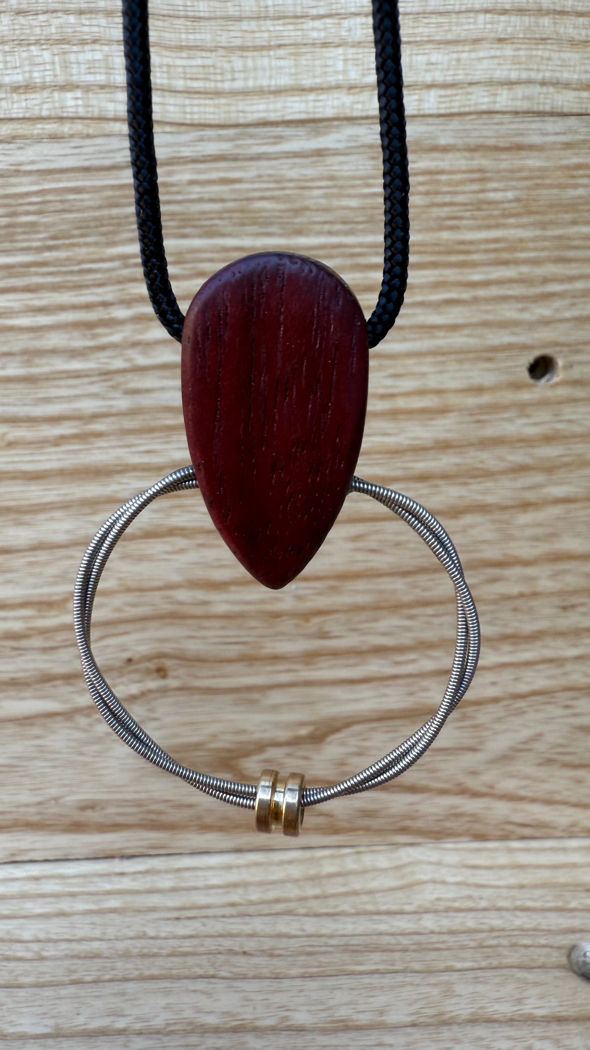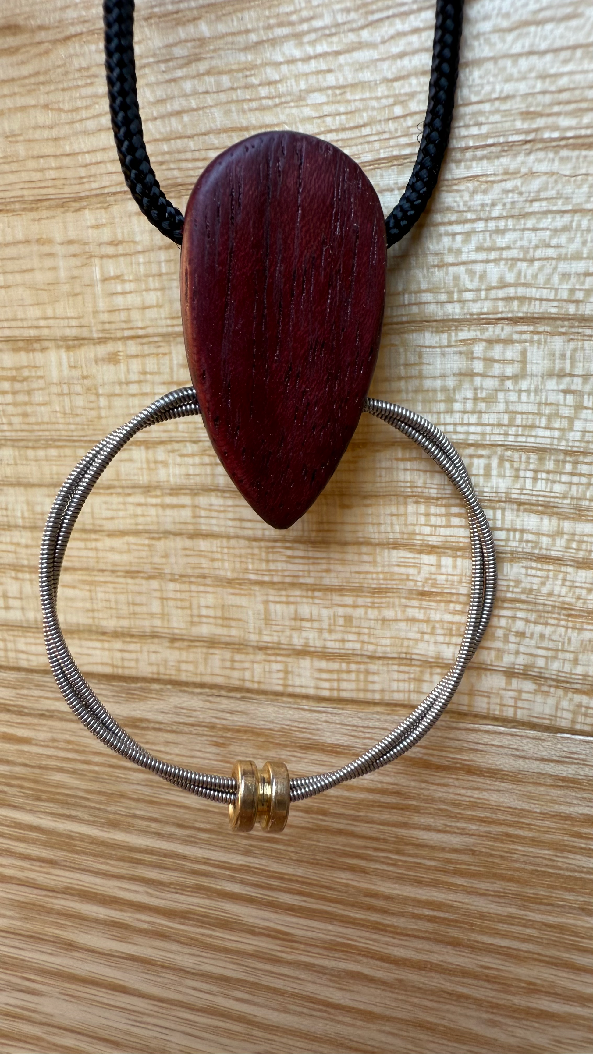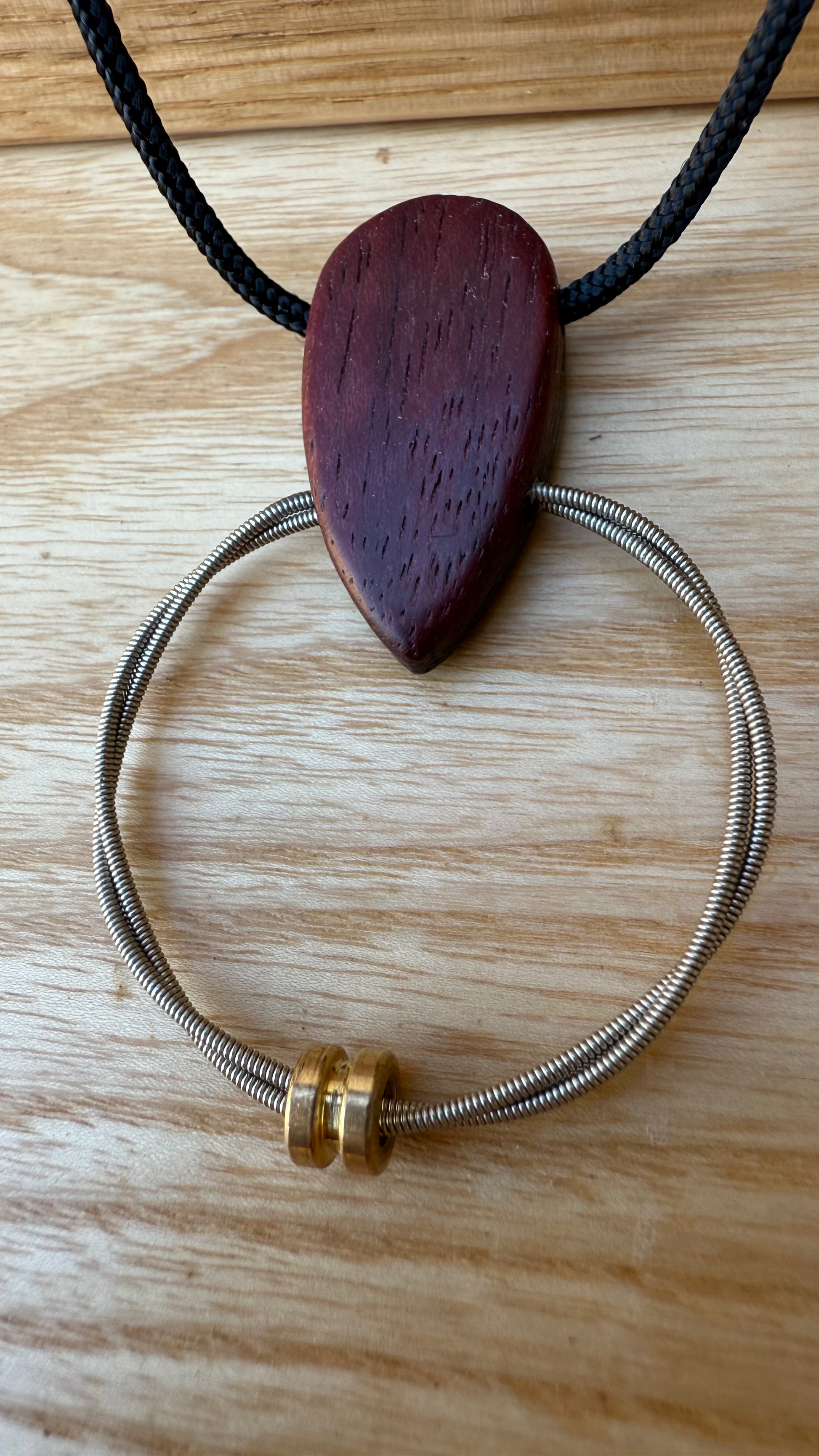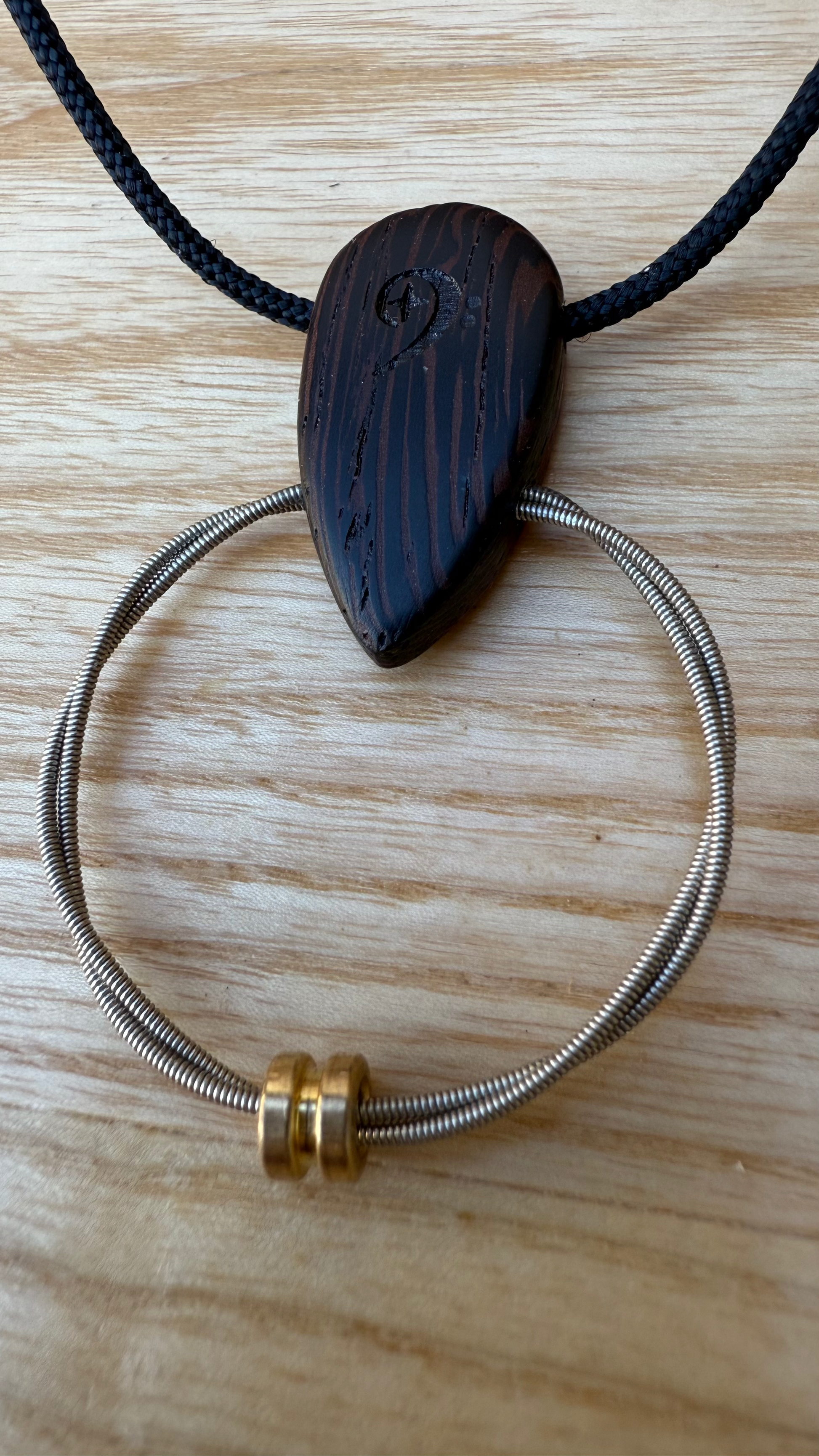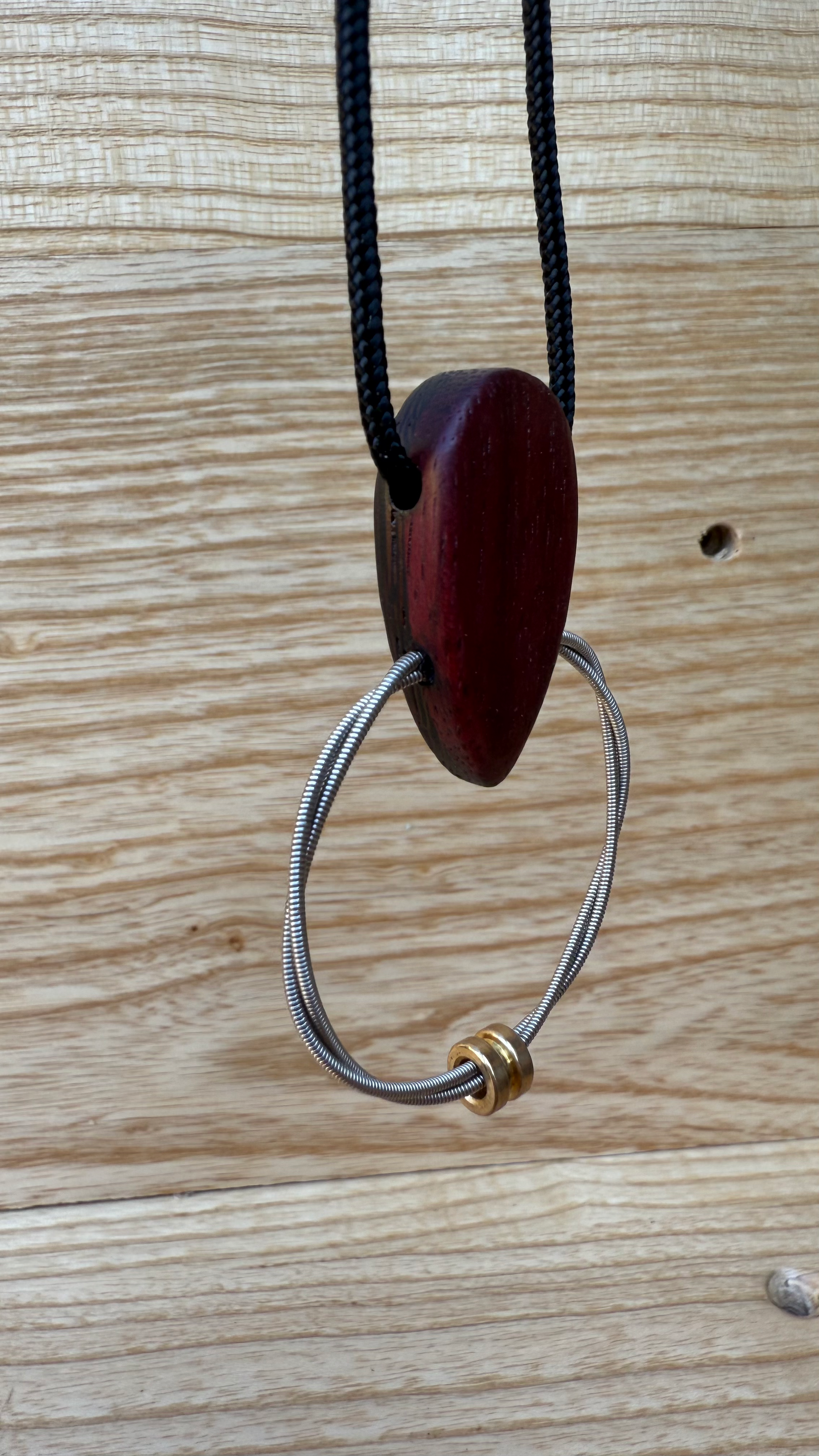 La corda, completa del blocco dorato per ponte, forma un cerchio da 40 mm di diametro, mentre l’inserto centrale in legno misura 16,5 x 32 mm. Il ciondolo completo arriva a 57 mm di altezza. Ogni dettaglio è rifinito a mano con olio vegetale naturale, senza vernici o trattamenti chimici.