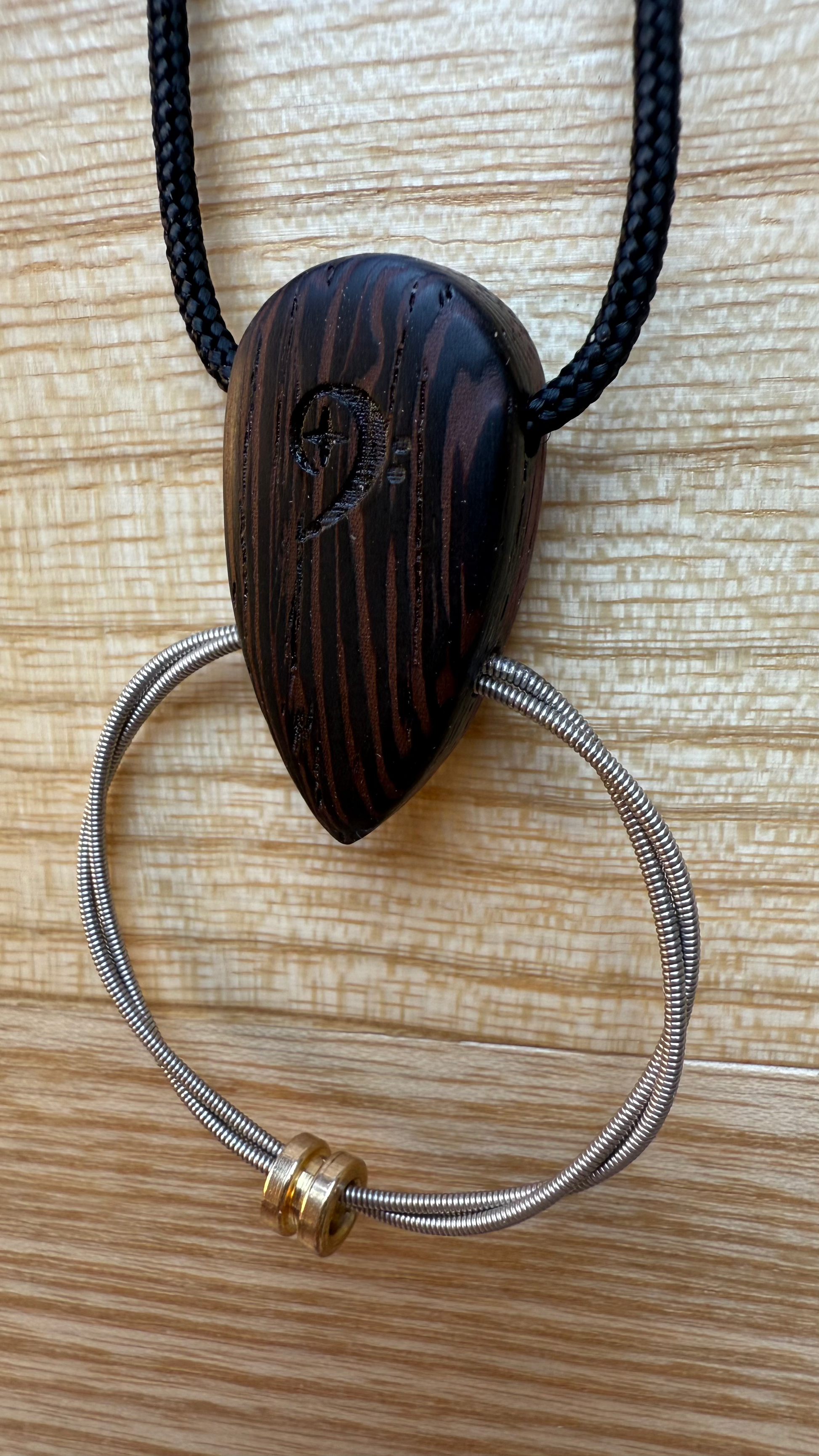 Owed to ’G’ è un ciondolo unico, realizzato a mano utilizzando la corda G (Sadowsky Strings) di basso – l’anello che forma la struttura esterna – unita a un inserto in legno di wengè inciso su un lato con il logo Dogstar (bass clef + stella), e amaranto liscio sul retro.