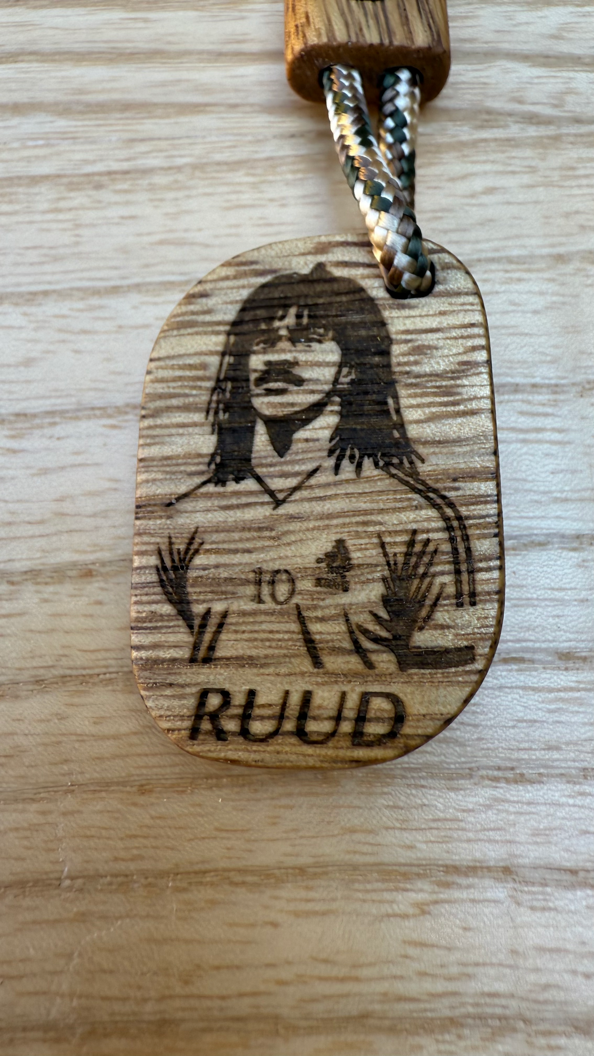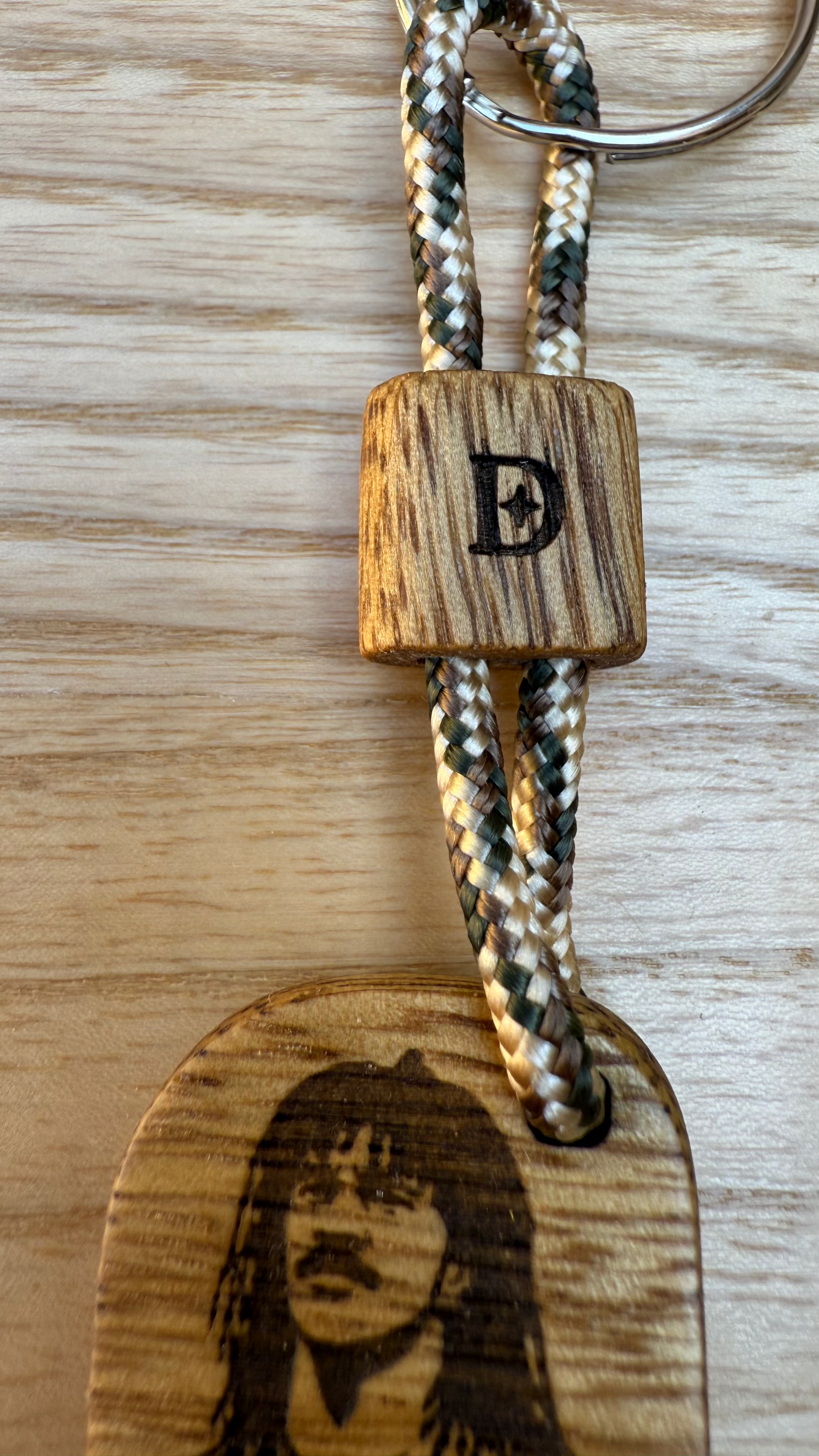 Questo portachiavi inciso ne rappresenta il profilo iconico in stile stencil, con la sua inconfondibile capigliatura e lo sguardo determinato. L’incisione è realizzata su legno di Korina e rifinita completamente a mano.